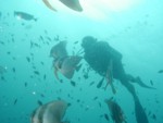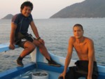 オープンウォーターが終わって結構島の生活にも慣れてきた。 スクールの皆さんと色々な話をしてタオ島の『タオ』は『亀』という意味だと知った。 そうすると、楽天の田尾監督はこっちにくると『亀監督』になるのか。いっそのこと日本名『田尾島』にして楽天のキャンプ候補地にでもすれば知名度が上がるな・・・なんて商売じみた事を考えながらアドバンスコースへ進んでいく。 アドバンス(Advanced)とは上級の〜と言う意味だオープンでは基礎知識を一通り習ったが、勿論すべてかじった程度なのでアドバンスではひとつひとつ専門的な経験を積んでいく。 2つの必須科目と3つの選択性科目の合計5科目講習を受ける。 もっと詳しい事を知りたい人は専門の本を読んで欲しい。 簡単に何が違うか私の選択した例でいうと、 @ディープダイブ : オープンでは18mまでしか潜れないが、アドバンスでは30mまで潜れる。この12mの差は大きく見れる魚が全然違うのだ。 Aナイトダイブ : 日が暮れてからライトを持って潜水する。見える範囲が狭い分じっくり魚が見えるし、ライトの視界に新しい魚が見えると宝物を発見したみたいで面白い。気分は川口浩である(ネタが古い!)。 B水中フォト : トップページにも載せたが名のとおり写真だ。これがまた面白い。魚にそっ〜と近づいて安定して撮る訳だが、初心者なので魚の直前で止まれない!気を抜くとプカッと浮いてしまったり、足を後ろの岩にぶつけてしまったりする。私のバディ(パートナー)で一緒に講習を受けたヤナガワ君は写真に集中していておもいっきりイソギンチャクの上にお尻から乗っかってしまい、体を『ビクッ!!』っとさせジタバタしていた。下がウニじゃなくて良かったね〜。 以上の事ができるようにになる。 今回のインストラクターはヒコさん(左側)。 右はトノさん。 ![]() 見た目どおりのナイスガイで私と同じ体育会系。 朝方はかなり口数が少ないが、時間と共に小気味よくなってくる。 こっちのペースに合わせて指導してくれるタイプのいい人だ。 1番おススメは『ナイトダイブ』で、勿論水中のおもしろいのだが潜水が終わり、最後水面に浮上した瞬間上を見ると満天の星空が広がっている。ダイビングをやるところは大抵まわりに光が少ないので日本の街中よりははるかに星が見えるし、それまで酸素ボンベで呼吸をしていた多少の違和感から通常呼吸になる開放感とダイビングの達成感が交わり本当に気分爽快である! 帰りは船上でビールを飲みながら港へ、私+ヒコさん+ナイトを一緒に潜ってくれたトノさんの3人で寛ぎのひと時を過ごす。 ◇ ◇ ◇ ◇ ◇ ◇ ◇ ◇ ◇ ◇ 今回お世話になった、ブッダビューリゾートは結構おすすめです。(マージンとか貰ってませんよー) 学科の講習会場も最近建て直したみたいで綺麗でした。 イントラ軍団のサトルさん・ミノルさん・ヒコさん・トノさん・ヨシさん・ソラさん・タエさん・シータン・シノブさん、有難うございました。 おかげで今後も楽しくダイビングができそうです。 興味のある人は⇒ http://www.taotou.com まで ※バンコクから1,500円位で移動できるので、あまりお金を掛けずに取得したい人はおすすめ。バスつきプランも有。 ※ファンダイブ(通常のダイビング)は機材込みで1本700バーツ(2,000円)だそうです。 ←私です。 |