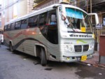 ムンバイのクロフォードマーケットからやや南のメインストリートから高架道路側へ入ったところにバス会社の代理店が20軒くらい密集している。その中のSMITTOURという会社で申し込む。エアコンなしで250ルピー、エアコン車で350から450ルピー位。私は「KHURANA」というキレイなバス会社指定で20ルピーまけてもらい申し込む。VOLVO製でシートが座りやすく、↑前回のバスと同じくらい快適だった。