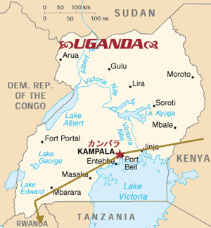 カンパラからルワンダのキガリまでは2社のバス会社が直通運行をしている。Jaguar(ジャグア)社は一日4便運行しており、朝5・6・7時など早い便は横5列シートのバスで20,000Ush、8・9時発は4列シートで25,000Ush。オフィスは以前の場所から移転して、タクシーパークがある大通りNamirembe通りを西へ、川を渡ってから坂をあがって10分程度歩いた左側にある。電話:0782417512で電話予約OK、代金は出発日の1時間前に現地で払えばOK.。ルワンダとウガンダは時差があり、1時間ルワンダが遅いので実際は所要9時間。道路状況はほぼ舗装道路で良好。国境も特に問題なし。ルワンダビザは国境で申請可能、所要約10分。 もう1社のRegional社は街中GPOの近くにオフィスがあり、9時半発で25,000Ush、4列シート。どちらも各オフィス発。